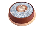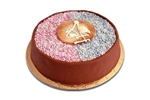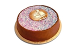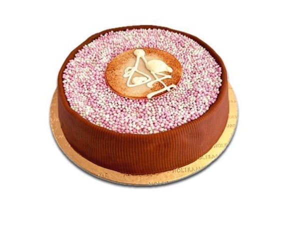 Slagroom, biscuit, frambozenconfiture, marsepein en blauwe, roze of een mix aan muisjes. Afgemaak met een ooievaar
