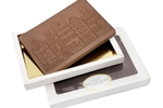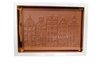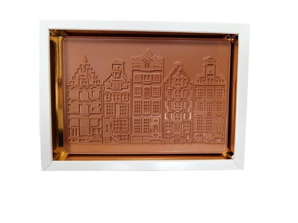 Plak van melk chocolade met een design van grachtenhuisjes. Ongeveer 145 gram