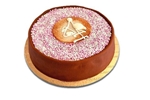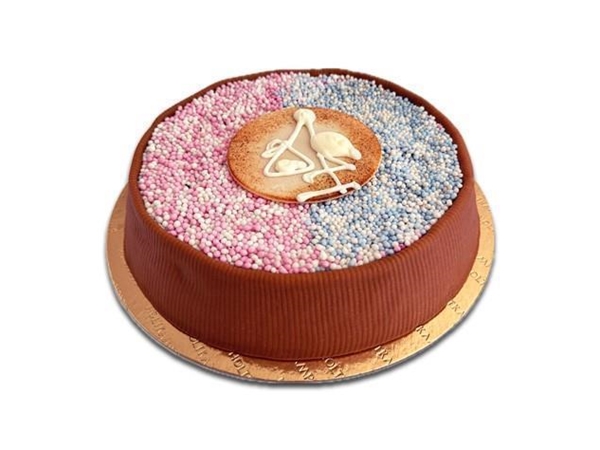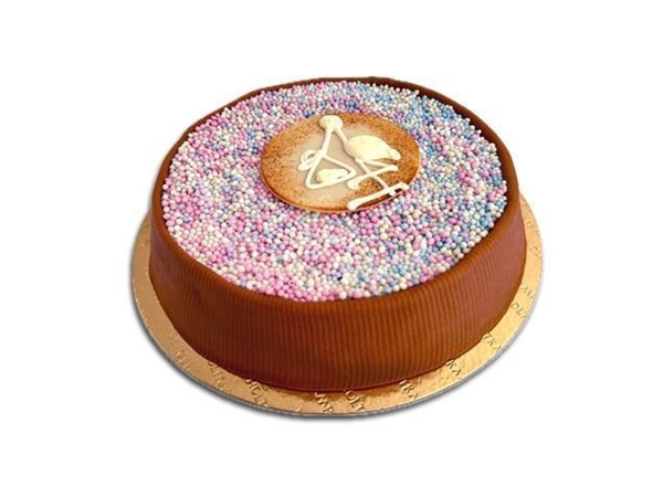Slagroom, biscuit, frambozenconfiture, marsepein en blauwe, roze of een mix aan muisjes. Afgemaak met een ooievaar